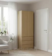 Высокий шкаф, достигающий 222 см в высоту, вмещает множество вещей благодаря трем выдвижным ящикам, вешалке, полкам и просторному верхнему отделению для крупных предметов. Дверцы шкафа оснащены петлями с доводчиком, которые обеспечивают тихое и плавное закрывание. Эти петли также имеют современную систему регулировки в трех направлениях.