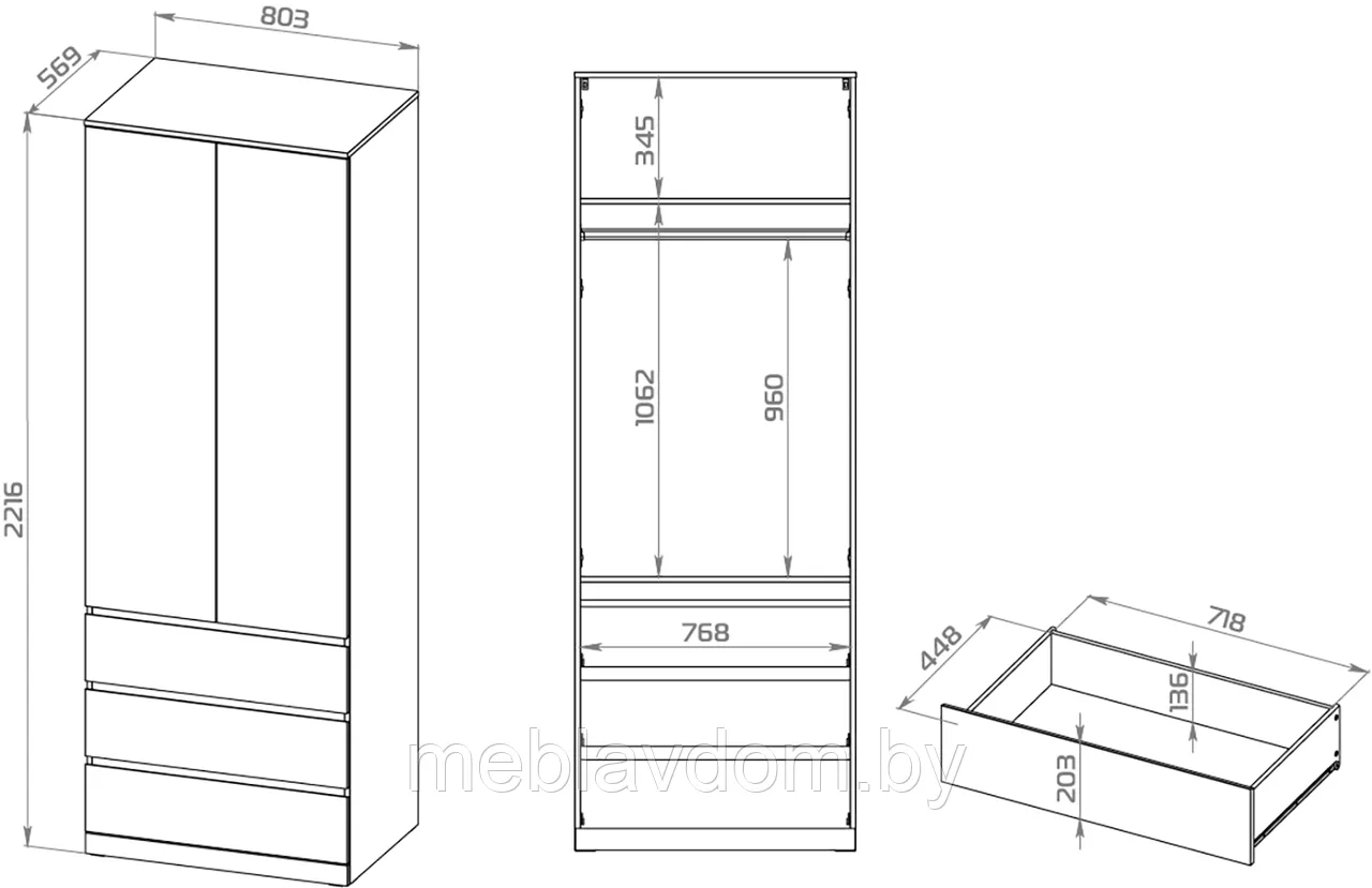 Габаритные размеры: 222х80х57 см ВхШхГ